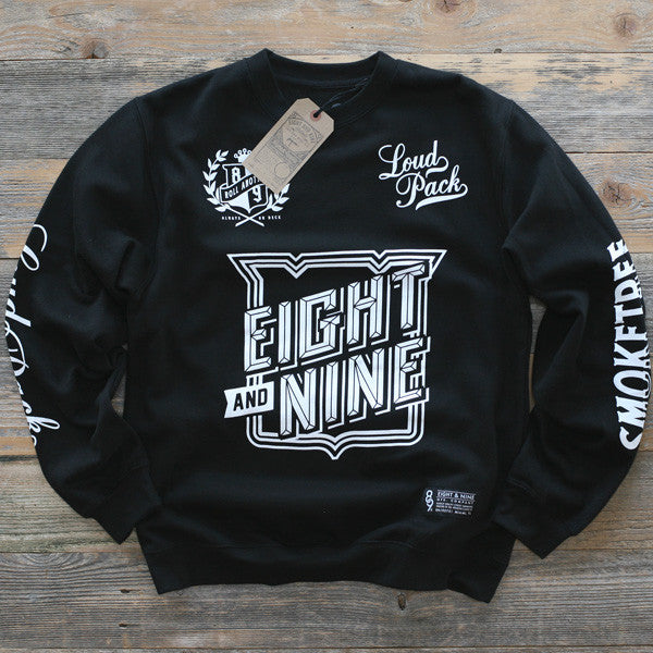 New for winter '14 SmokeTree hockey inspired Crewneck Sweatshirt. Premium black fleece, white print, check the details, Roll Another crest, Loud Pack, SmokeTree name plate. You shop 8&9 for a reason. Essential black and white jersey style for the colder weather. #8and9life