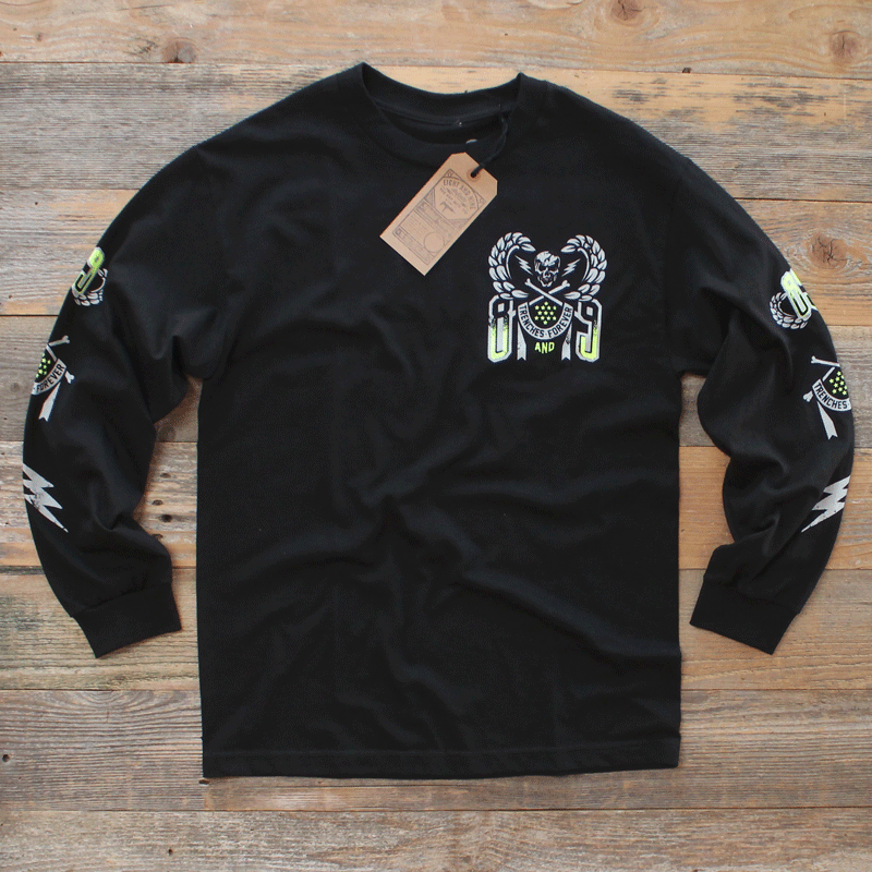 New for Spring '15. Sniper Team long sleeve jersey tee. White and volt on premium black heavy weight cotton. Sleeve hits, jumbo back and left chest. Peep the details, inspired by the trenches. #8and9life