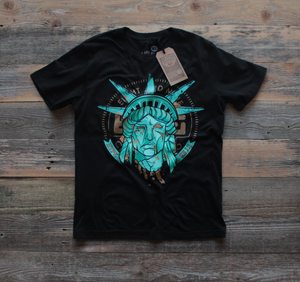 Hype Kills design collaboration with Freehand Profit. This is the perfect shirt to match the Nike Air Hyperposite Statue Of Liberty. Black tee w/ Crystal Mint/Metallic Copper print. s-4X available get yours.