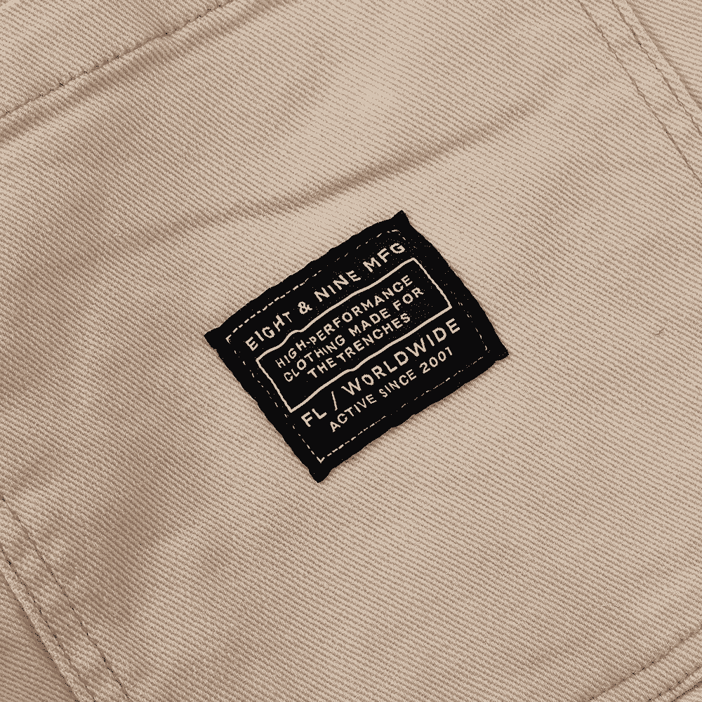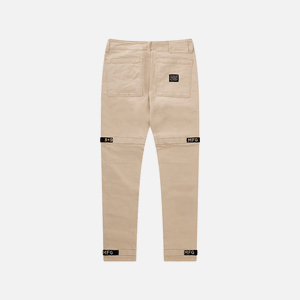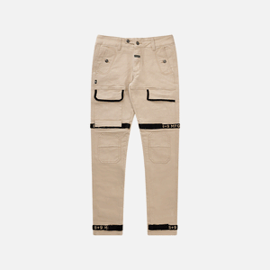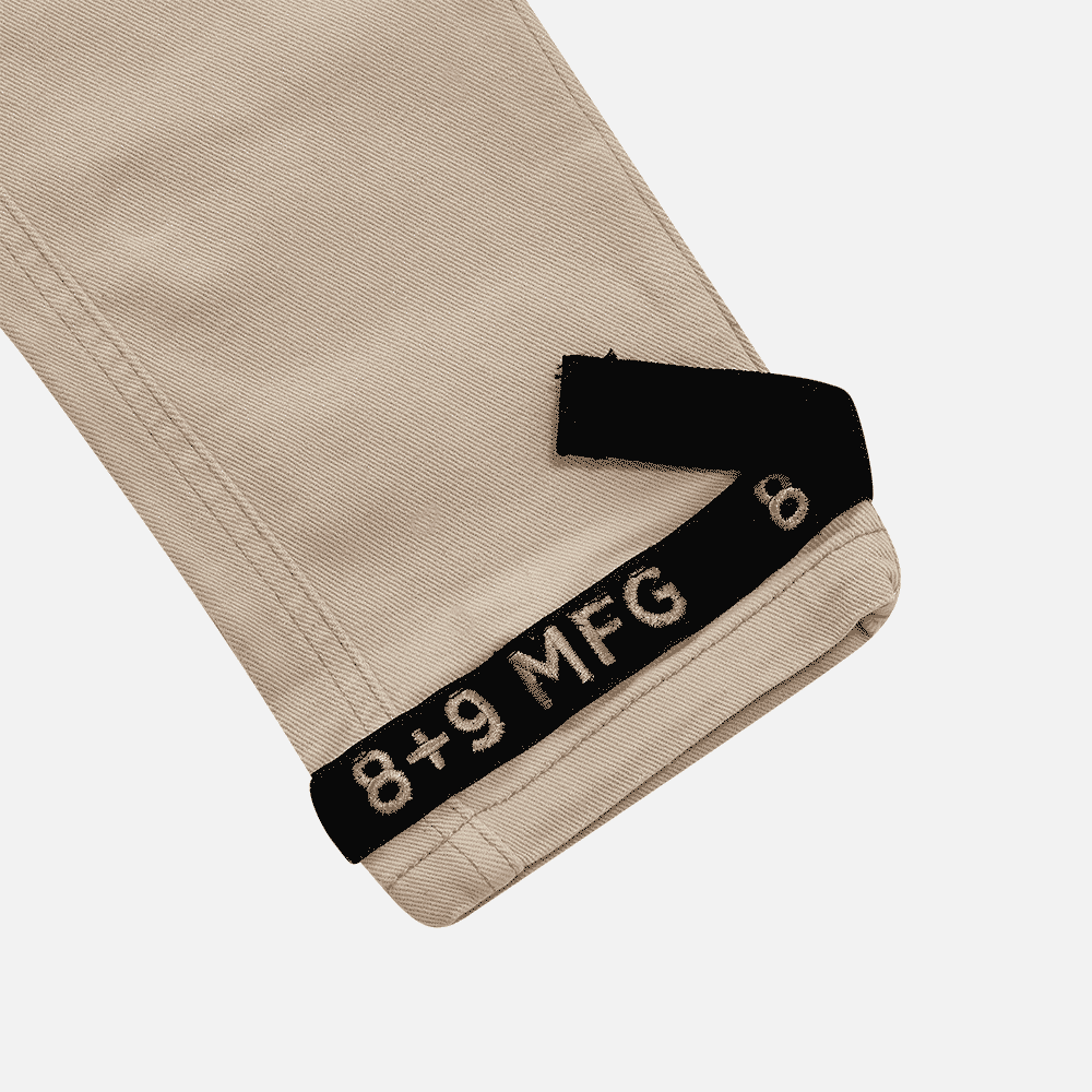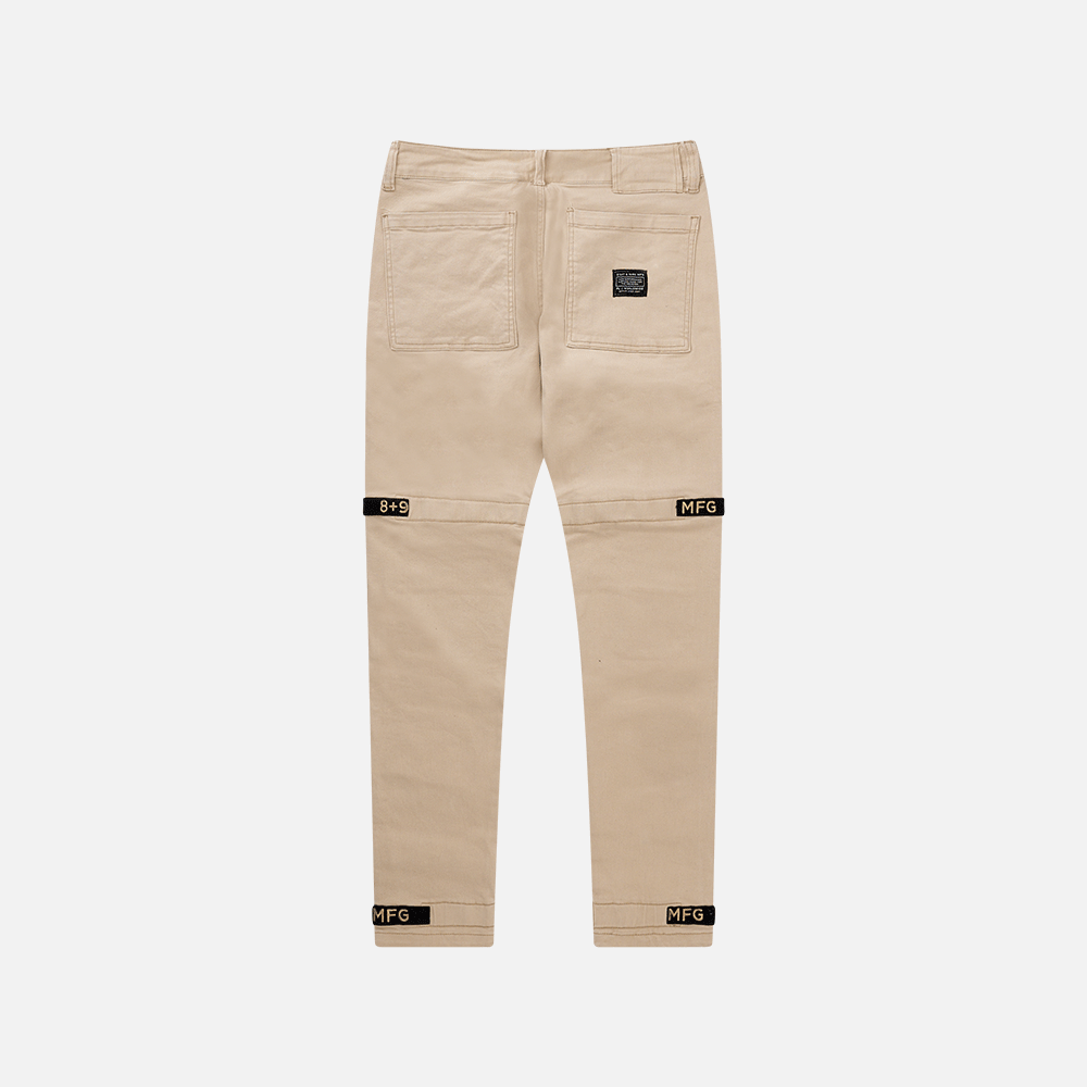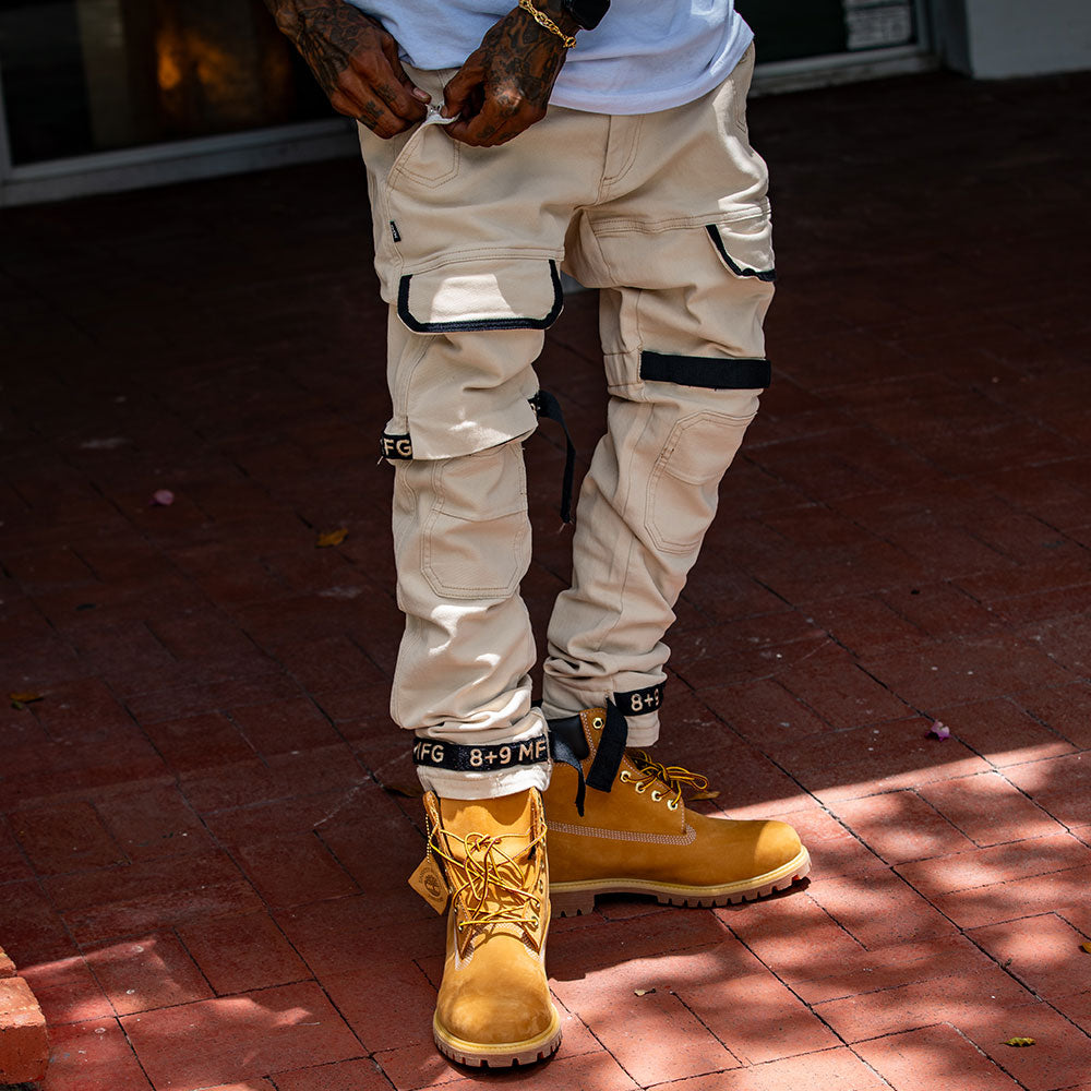 Premium Sand jeans with black straps.. Inspired by the early 2000's these Strapped Up Utility Jeans get the job done. Modern fit, room up top slimmer below the knee, straps for custom fit. Classic men's jeans with front cargo pockets, velcro straps with 8&9 MFG embroidery. Model is wearing 34.