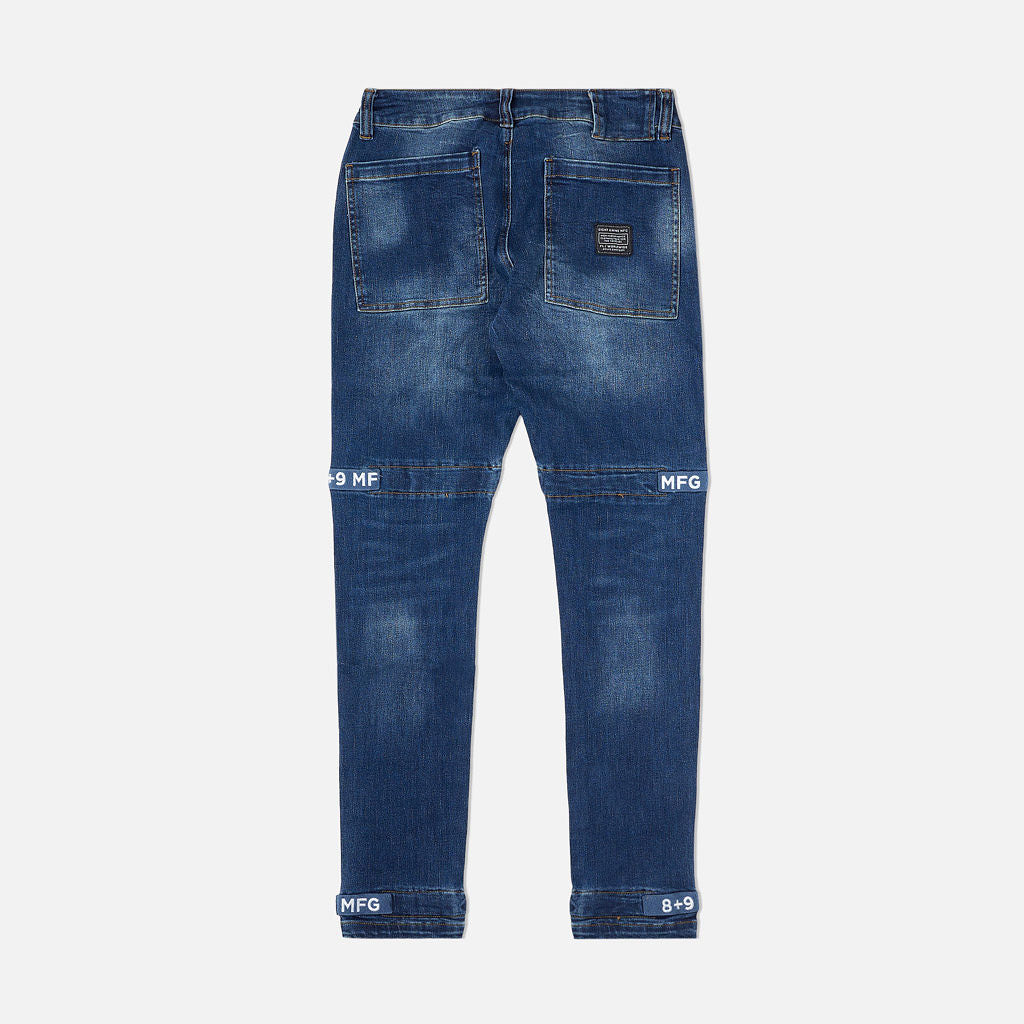 Premium light washed denim, subtle wash, faded look, navy straps, white accent embroidery. Inspired by the early 2000's these Strapped Up Utility Jeans get the job done. Modern fit, room up top slimmer below the knee, straps for custom fit. Classic men's jeans with front cargo pockets, velcro straps with 8&9 MFG embroidery. Model is wearing 34.