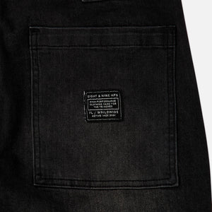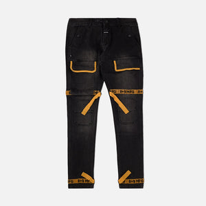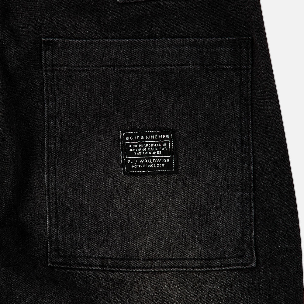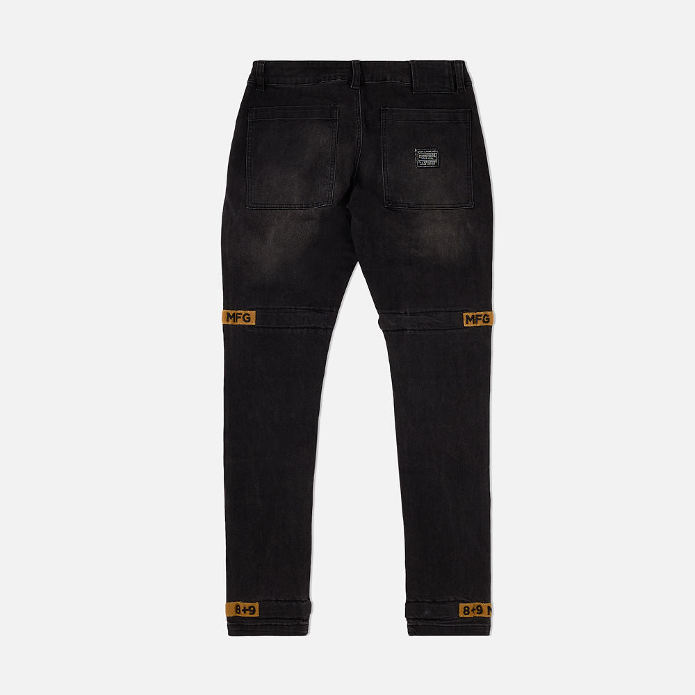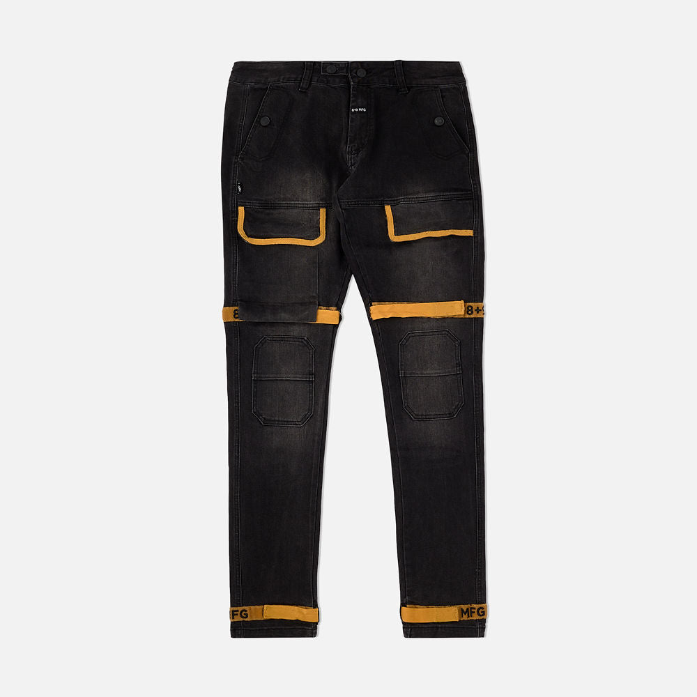 Premium black denim, subtle wash, faded look, gold straps, black accent embroidery. Inspired by the early 2000's these Strapped Up Utility Jeans get the job done. Modern fit, room up top slimmer below the knee, straps for custom fit. Classic men's jeans with front cargo pockets, velcro straps with 8&9 MFG embroidery. Model is wearing 34.