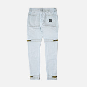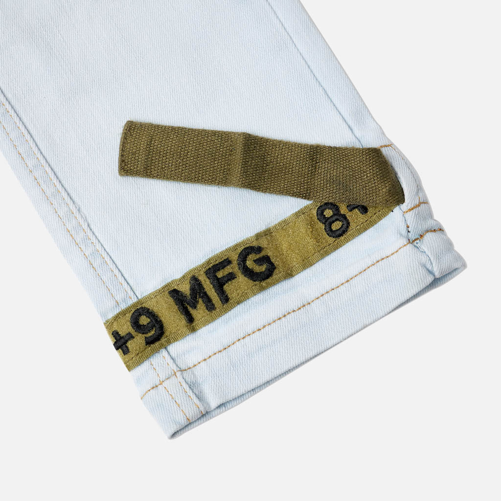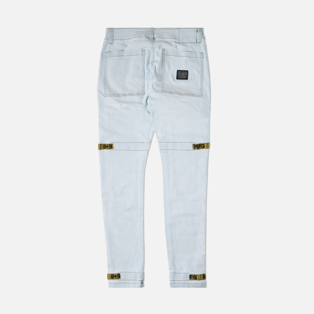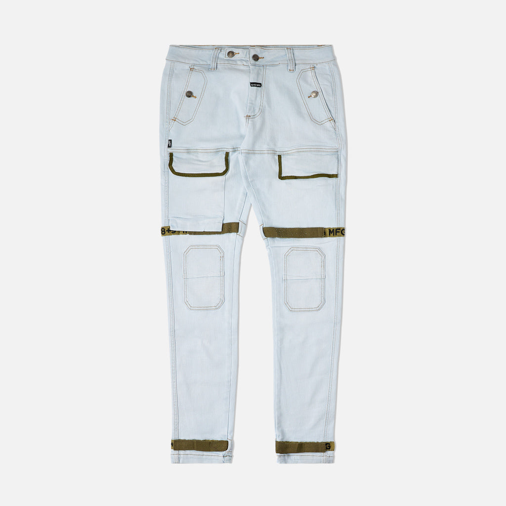 Premium light washed denim, subtle wash, faded look, olive straps, black accent embroidery. Inspired by the early 2000's these Strapped Up Utility Jeans get the job done. Modern fit, room up top slimmer below the knee, straps for custom fit. Classic men's jeans with front cargo pockets, velcro straps with 8&9 MFG embroidery. Model is wearing 34. Matches Air Jordan Retro 4 Olive and Jordan 5 Olive!