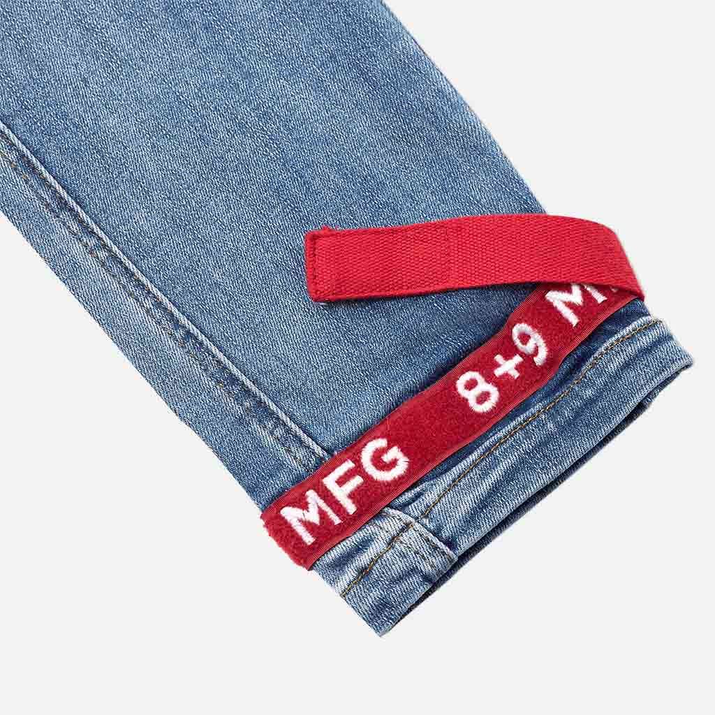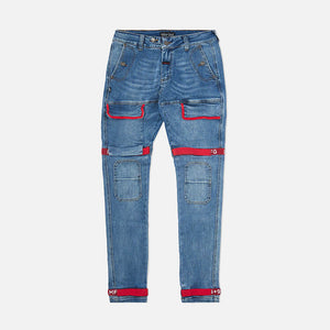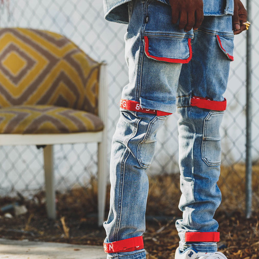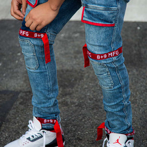 Premium medium washed denim, subtle wash, faded look, red straps, white accent embroidery. Inspired by the early 2000's these Strapped Up Utility Jeans get the job done. Modern fit, room up top slimmer below the knee, straps for custom fit. Classic men's jeans with front cargo pockets, velcro straps with 8&9 MFG embroidery. Model is wearing 34.