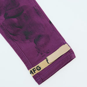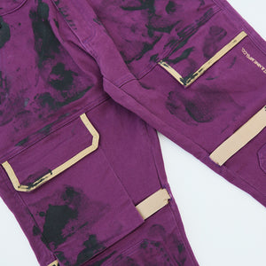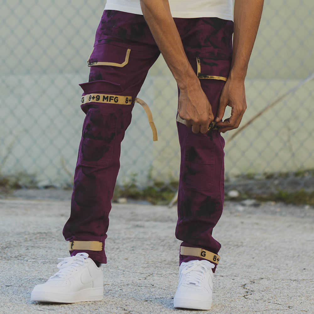 New premium berry washed twill, sand strap with black accent embroidery. Inspired by the early 2000's these Strapped Up Utility pants get the job done. Modern fit, room up top slimmer below the knee, straps for custom fit. Classic men's jeans with front cargo pockets, velcro straps with 8&9 MFG embroidery. Model is wearing 32.