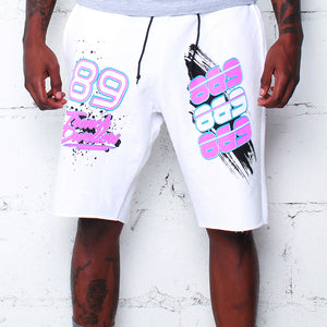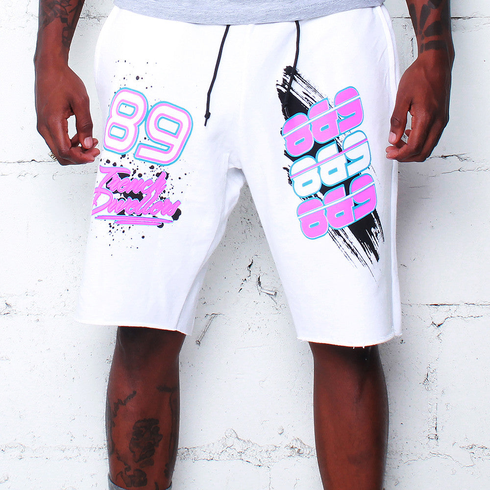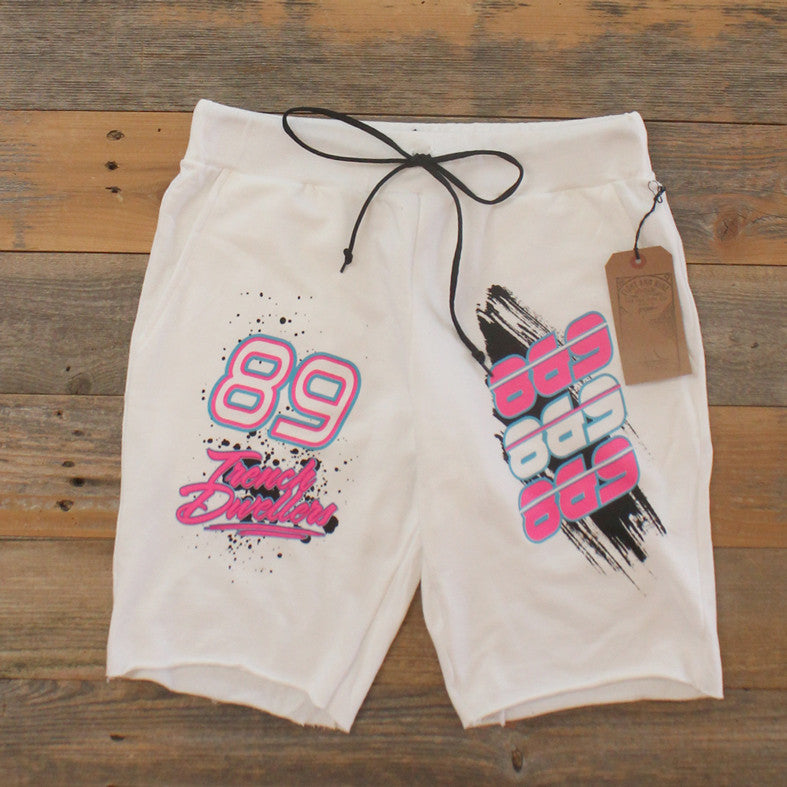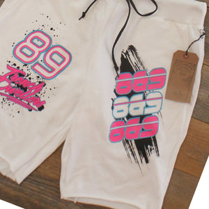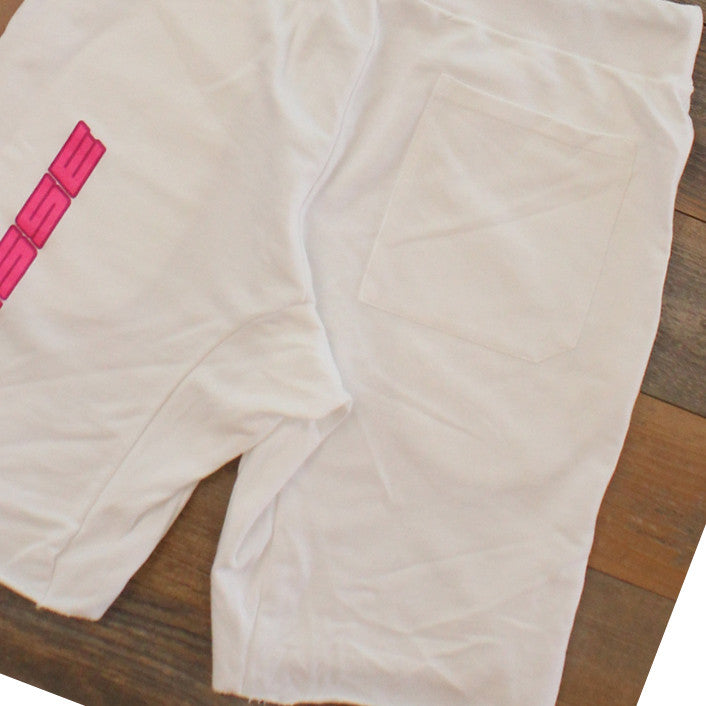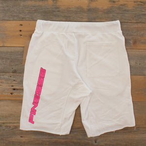 New for Summer. Team Finesse Cut off french terry shorts pure white with Neon Pink and Electric Blue. Simplicity reigns supreme. Super luxe 100% cotton french terry shorts made in the USA. Modern tailored fit, cut off styling w/ raw edge. #8and9life