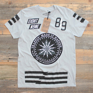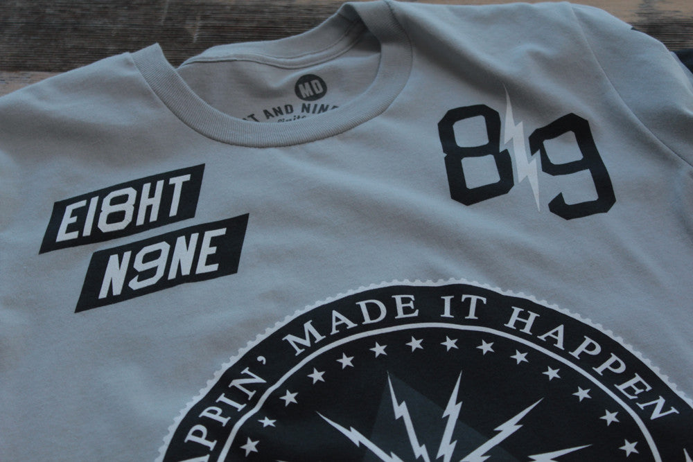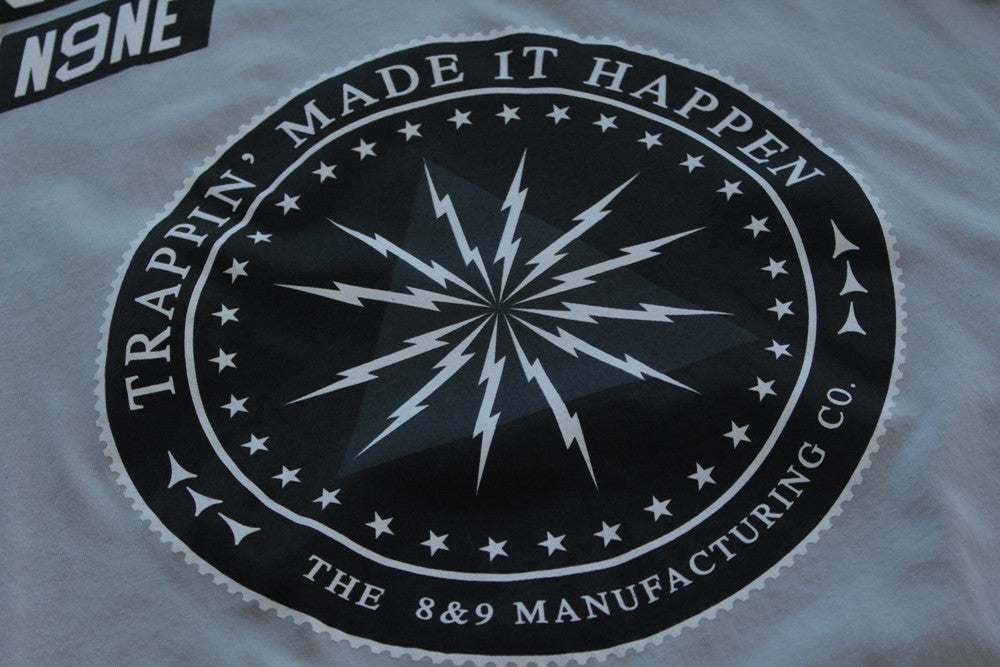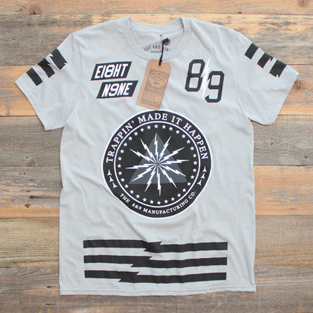 New release for Fall '14 hockey inspired Trappin Jersey tee. "Trappin Made It Happen" logo, lightning stripes, giant 89 back hit, chest and sleeve emblems. This is the perfect shirt to match Air Jordan Wolf Grey 3.