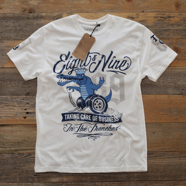 New for Spring '15, Trench Business White tee. Inspired by the Florida. Great shirt to match Jordan 11 Georgetown lows. White/Navy/Grey color scheme premium cotton, front, back and both sleeve hits. Great shirt. #8and9life