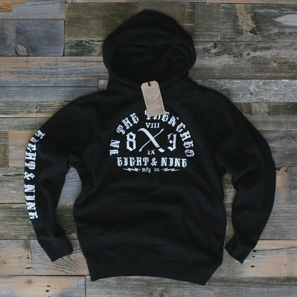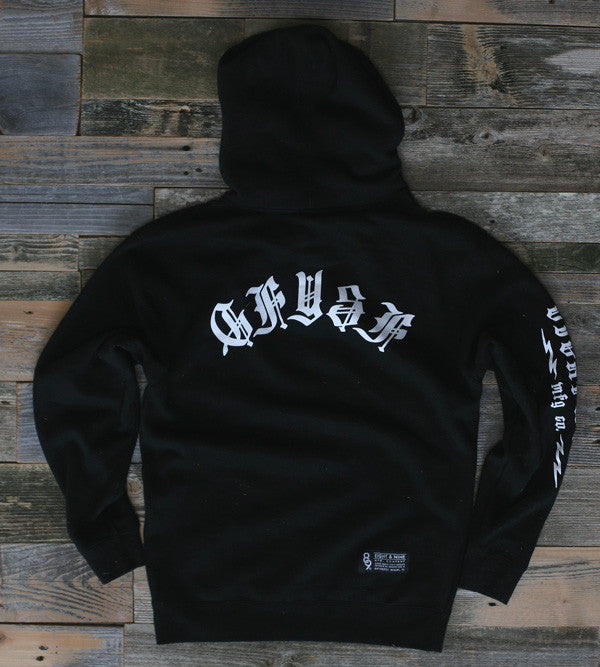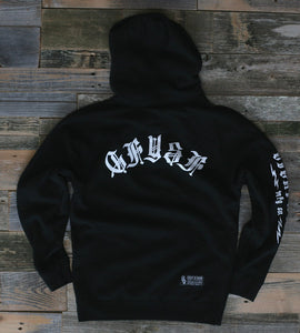 Heavyweight premium fleece hoody for Winter '14. Trench Dwellers chest piece, GFYSF name plate, sleeve hit and MFG woven label. Classic black and white scheme. No restocks.