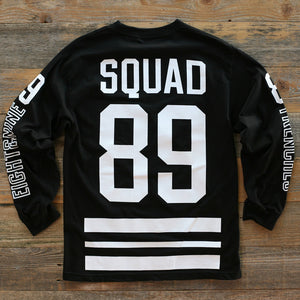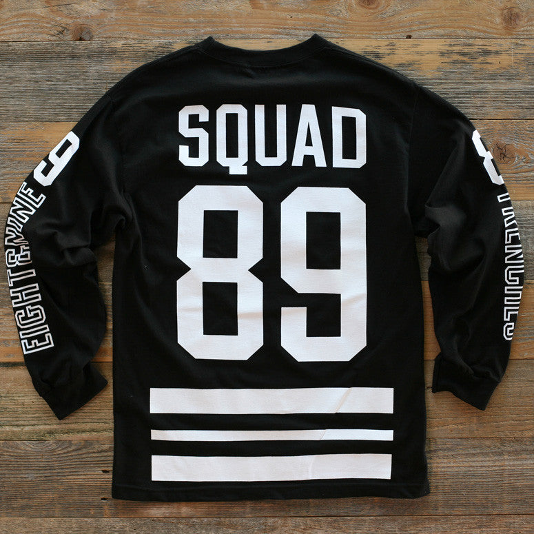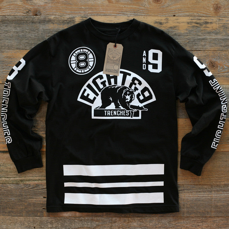 Winter 2014 Boston Bruins inspired alternate jersey piece. Forever in the trenches. Huge Squad 89 back print. Classic black and white detailing. Striped front and back with jumbo sleeve hits. Definitely a classic. Get yours. #8and9life #SQUAD