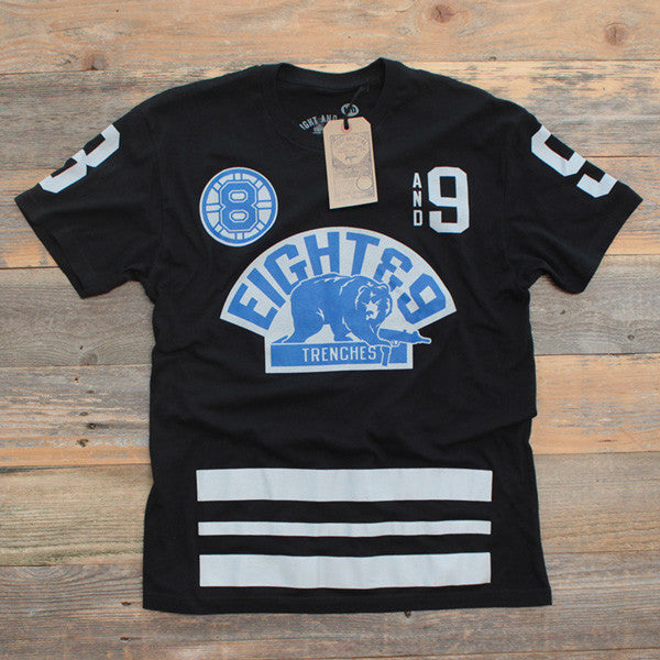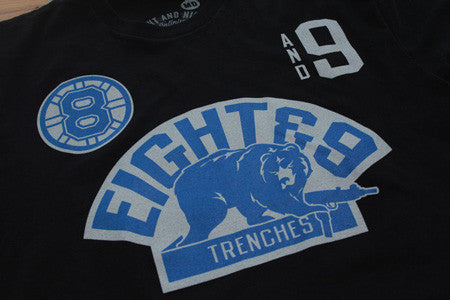 Fall '14 Bruins alternate jersey inspired piece. 8&9 life, forever in the trenches. Huge Squad 89 back print, remixed B's chest emblem w/ sleeve hits. Perfect shirt to match Air Jordan Sport Blue 3. S-4X.