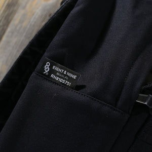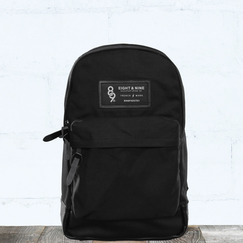 Black on black on black. A classic from the Everything Is For Sale Collection. Triple Black Canvas Backpack. Definitely not your average school bag. Classic black and white styling with full grain leather details. YKK zippers, leather mounted wovens, Trench Mark tags, quilted black guts, padded laptop stash and more!