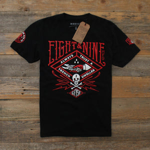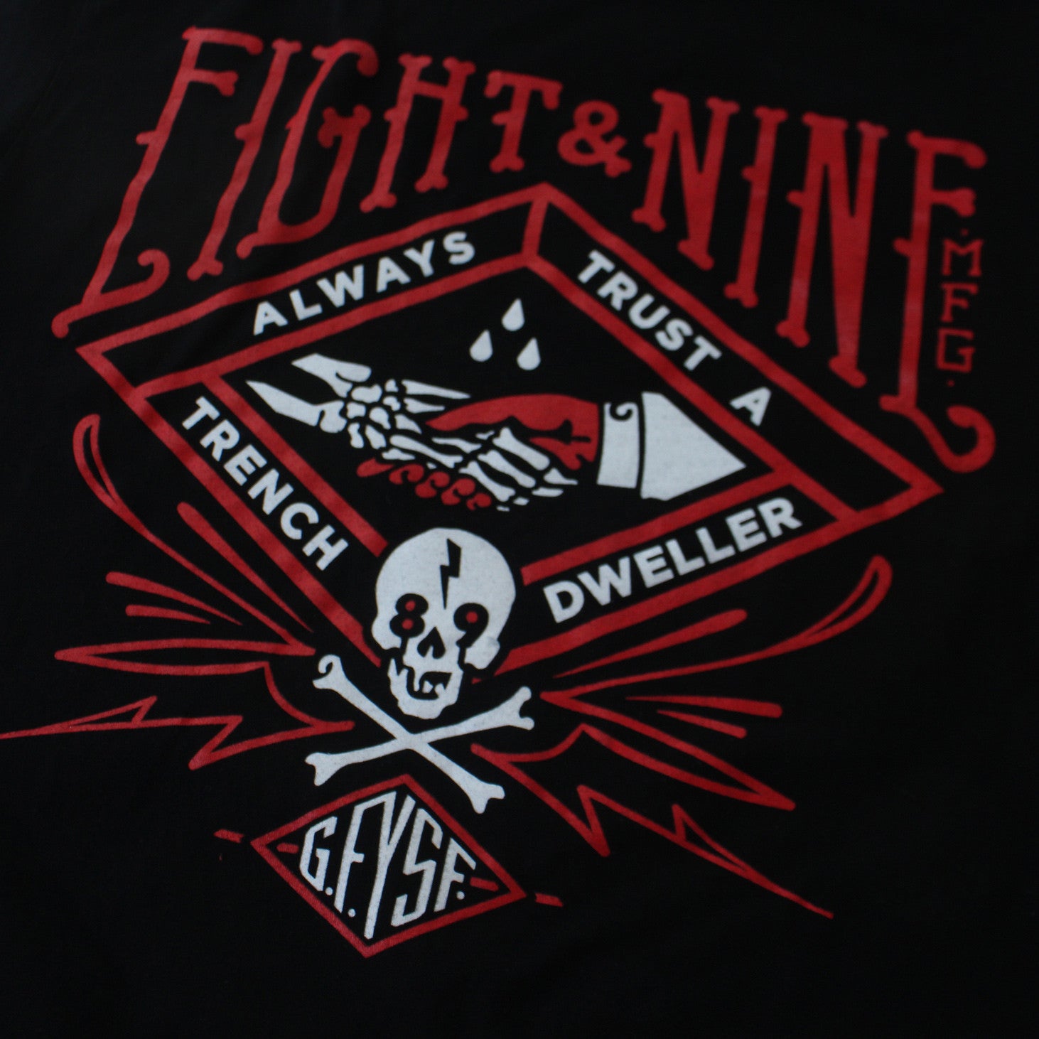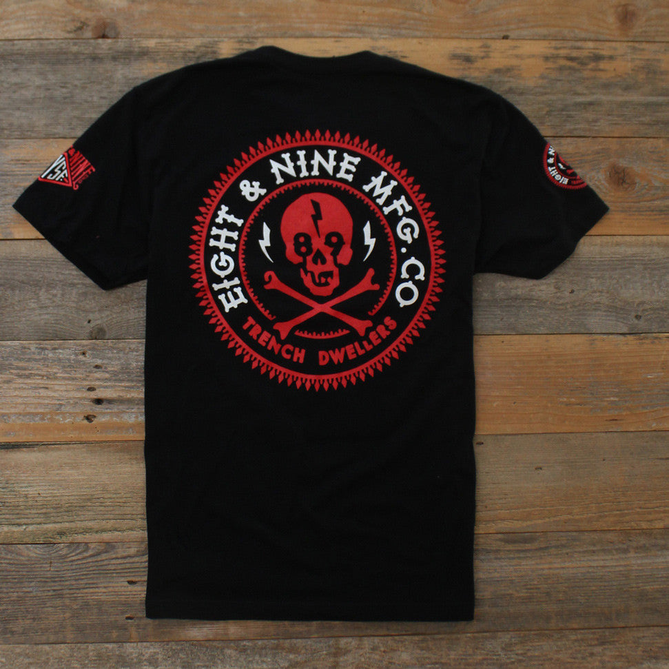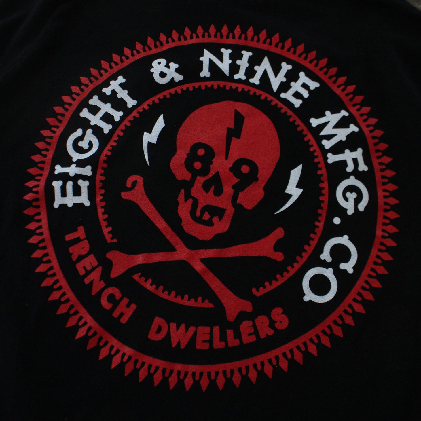 Always Trust A Trench Dweller. Blue collar inspirations for Summer '15. Classic bred color scheme. Peep the details. Premium black ringspun cotton with classic red and white prints front and back. #8and9life