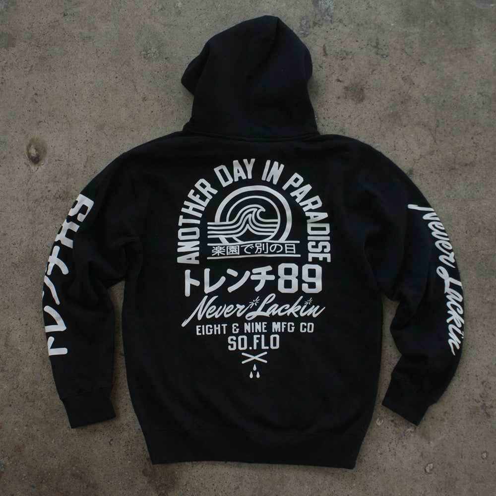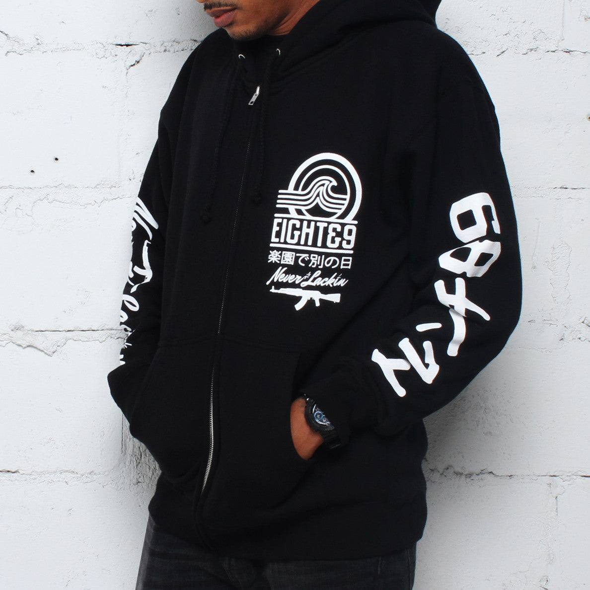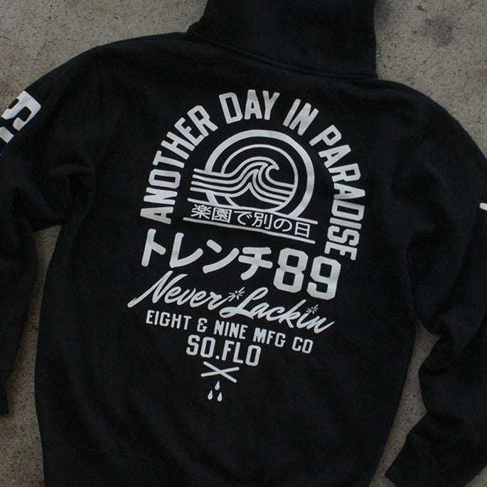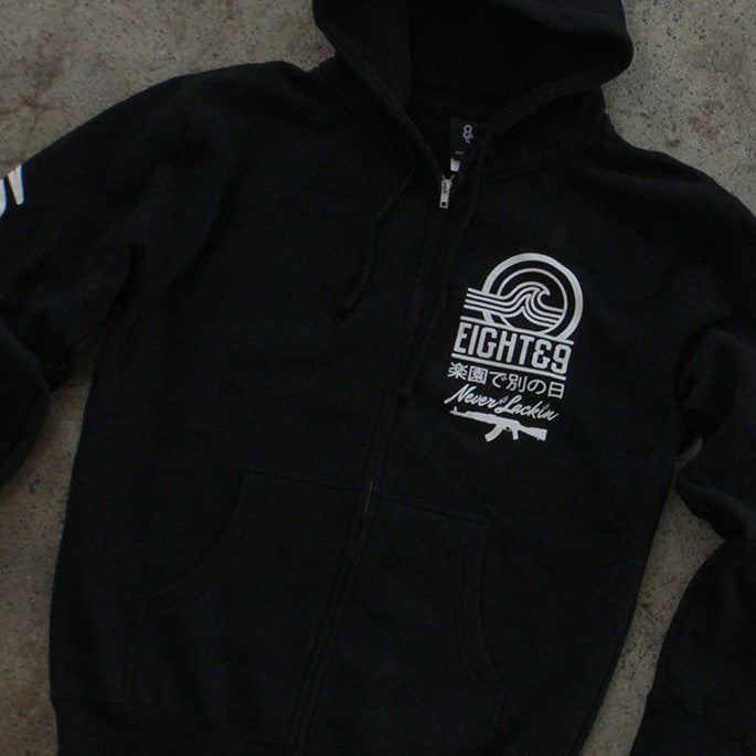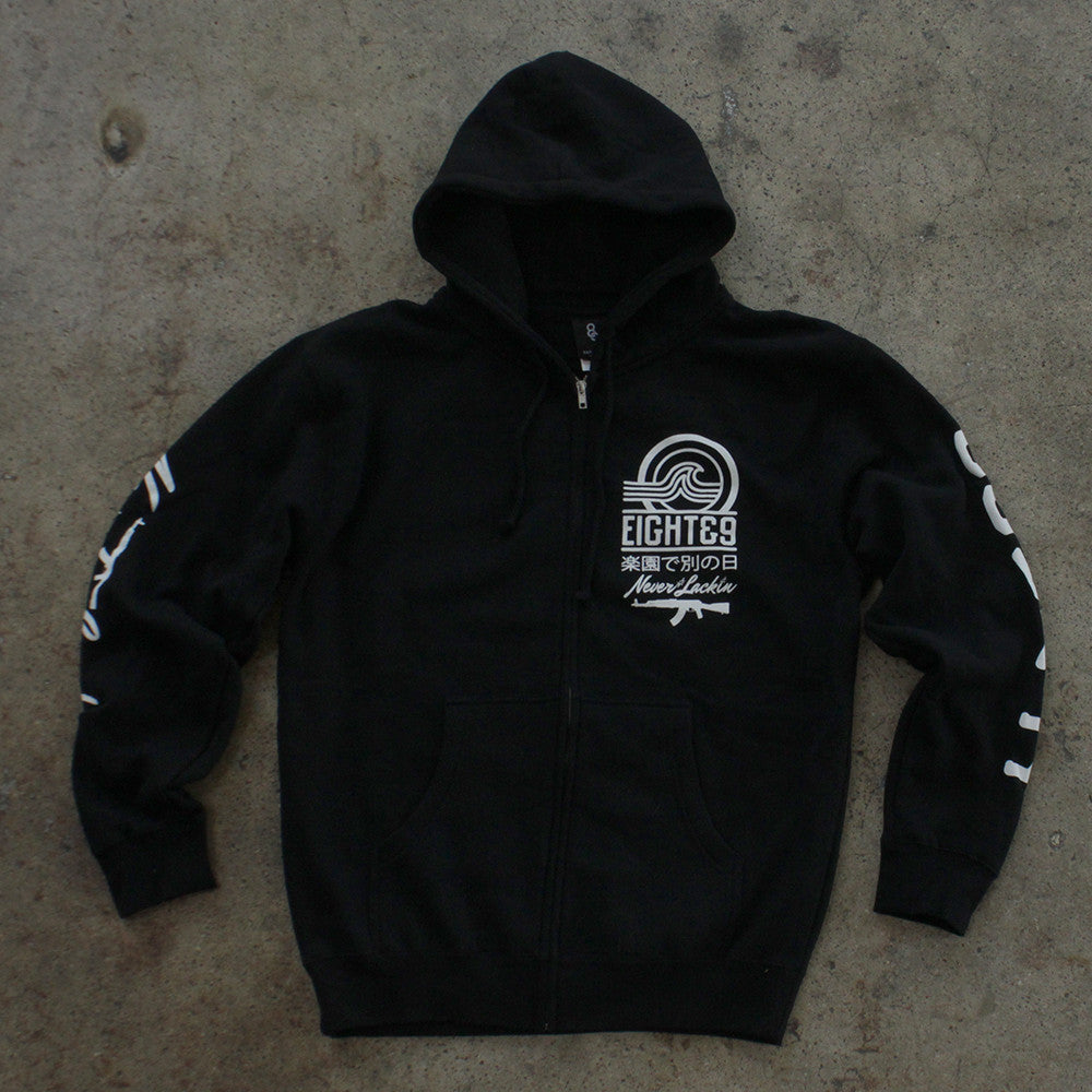 Tsunami Hooded Sweatshirt. Heavyweight. 100% premium cotton zip up hoodie with nickel zipper. Jet black with white, classic styling, front back and both sleeves. #8and9life Wavy.