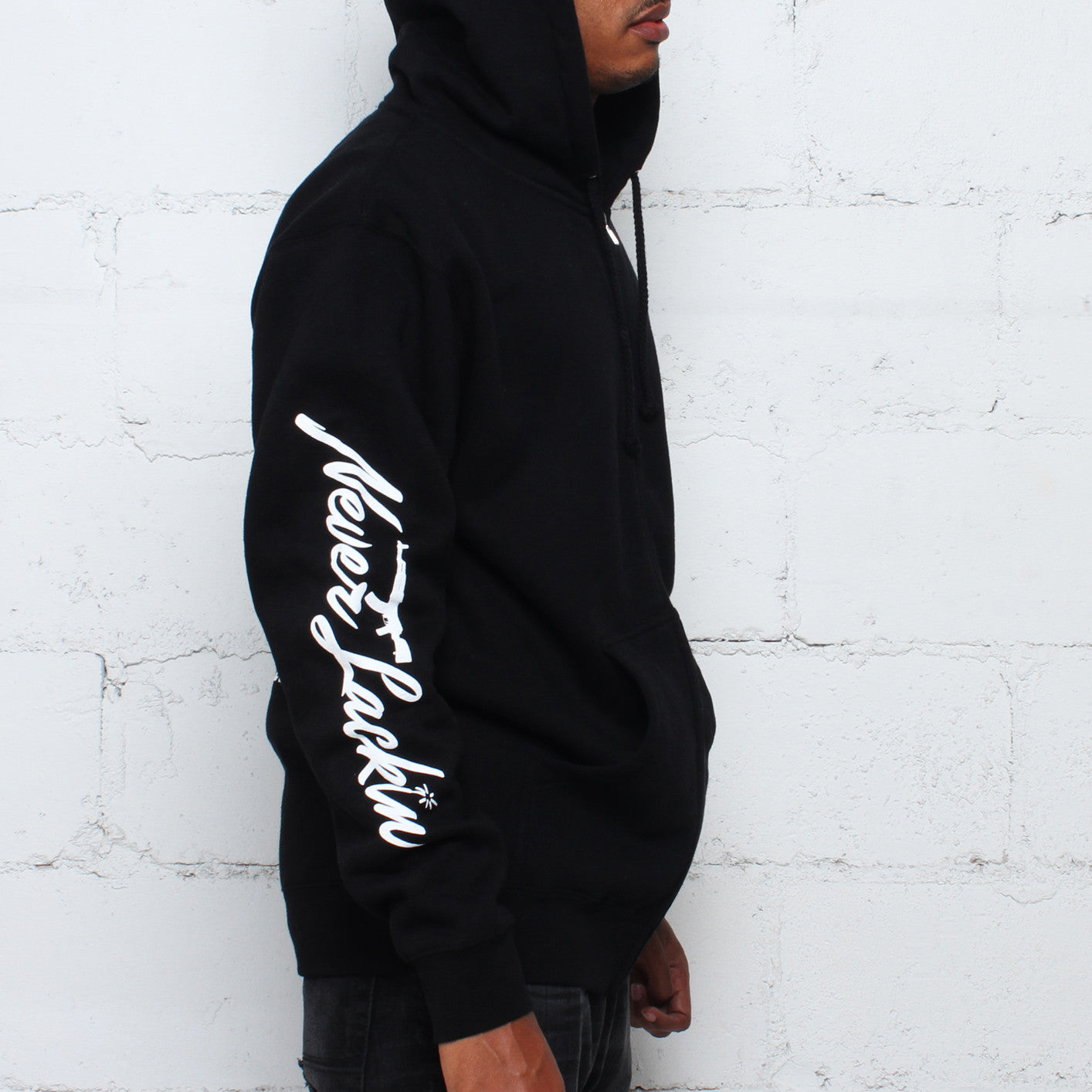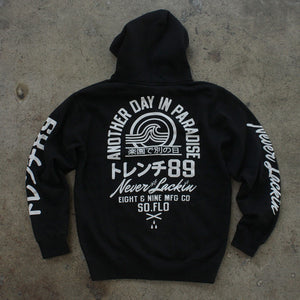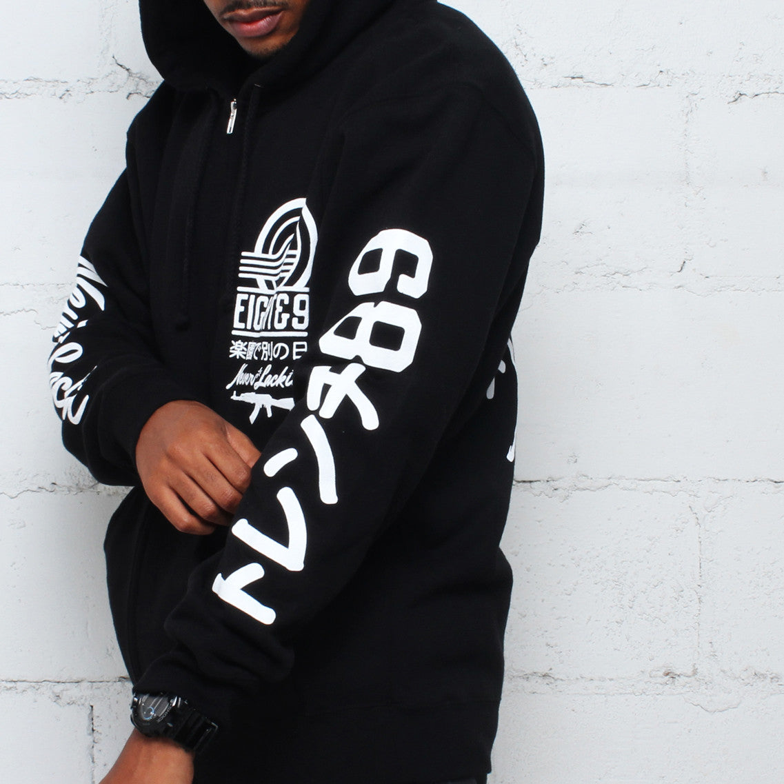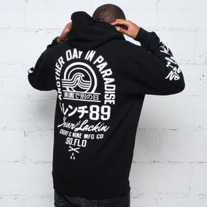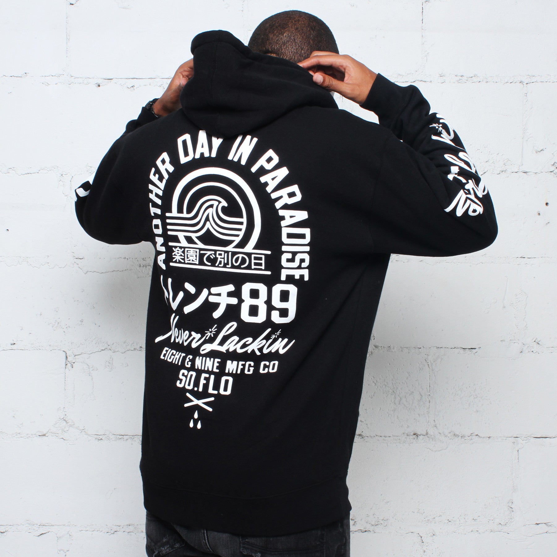 Tsunami Hooded Sweatshirt. Heavyweight. 100% premium cotton zip up hoodie with nickel zipper. Jet black with white, classic styling, front back and both sleeves. #8and9life Wavy.