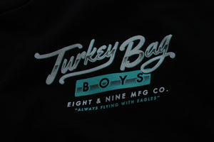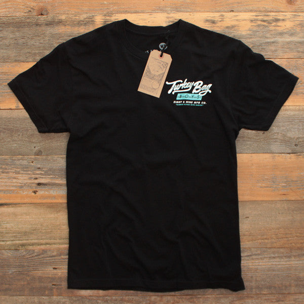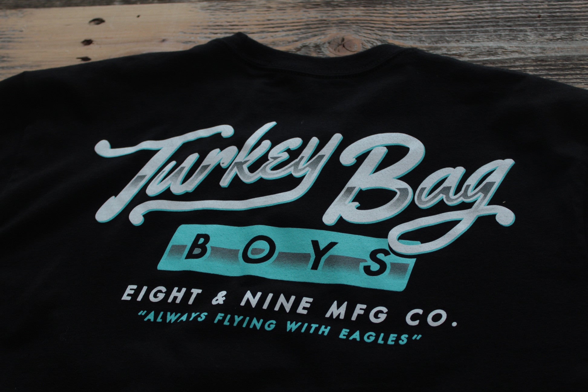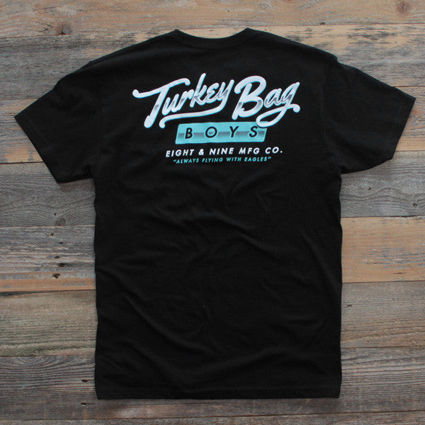 Hey, if you don't know feel free to ask. But yea, super clean for fall '14. Eight & Nine MFG Co. Left chest full back print. Turkey Bag Boys graphic in a black/tiffany color scheme. Simplicity reigns supreme.
