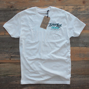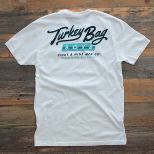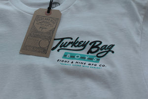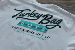 Hey, if you don't know feel free to ask. But yea, super clean for fall '14. Left chest full back print. Turkey Bag Boys graphic in a white and tiffany color scheme. Simplicity reigns supreme.