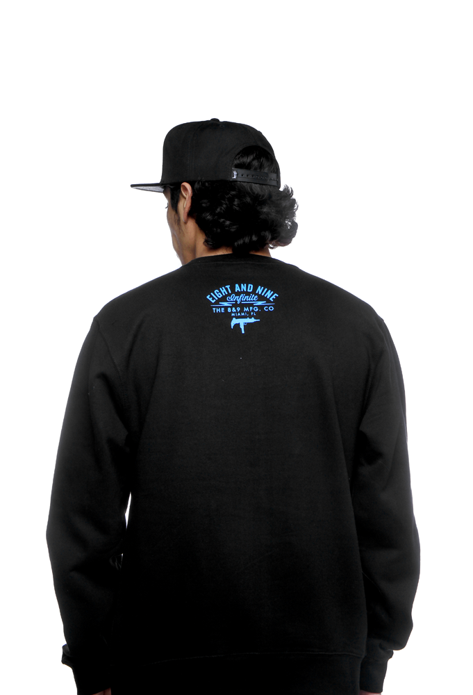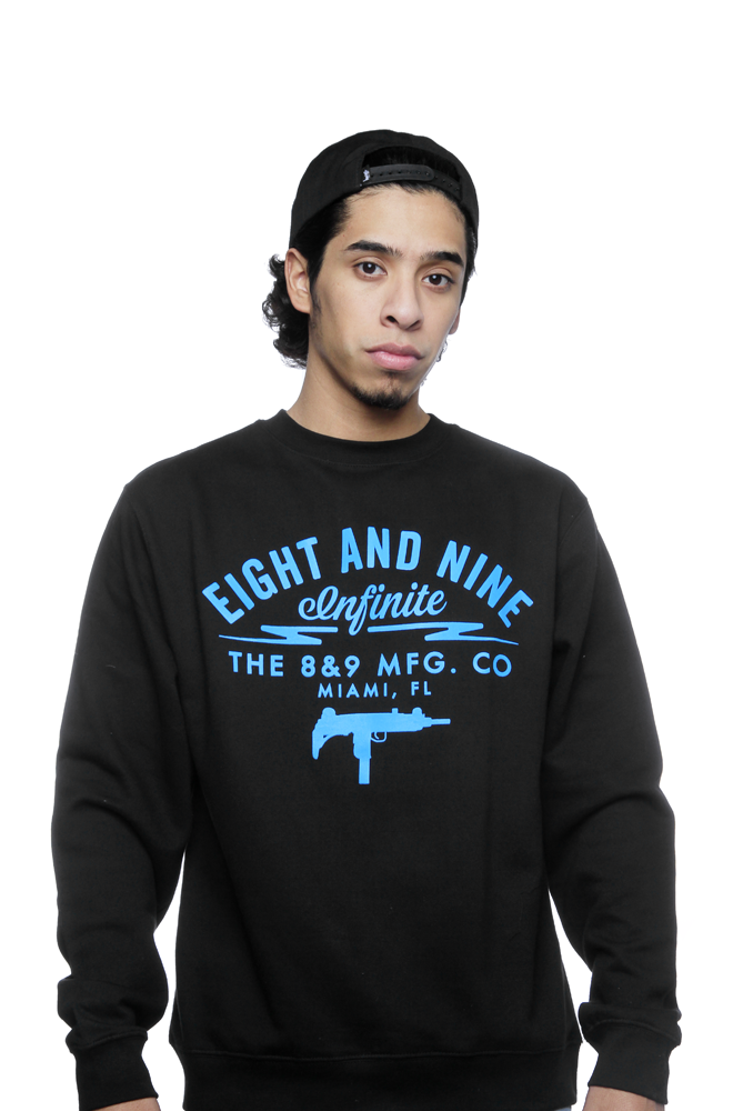 2014 Infinite Supply. UZI Co. 8&9 Manufacturing. Miami. Super soft black sweatshirt with dark powder blue. Perfect shirt to match Jordan Powder Blue 3 or Powder Blue 10.