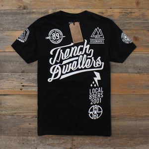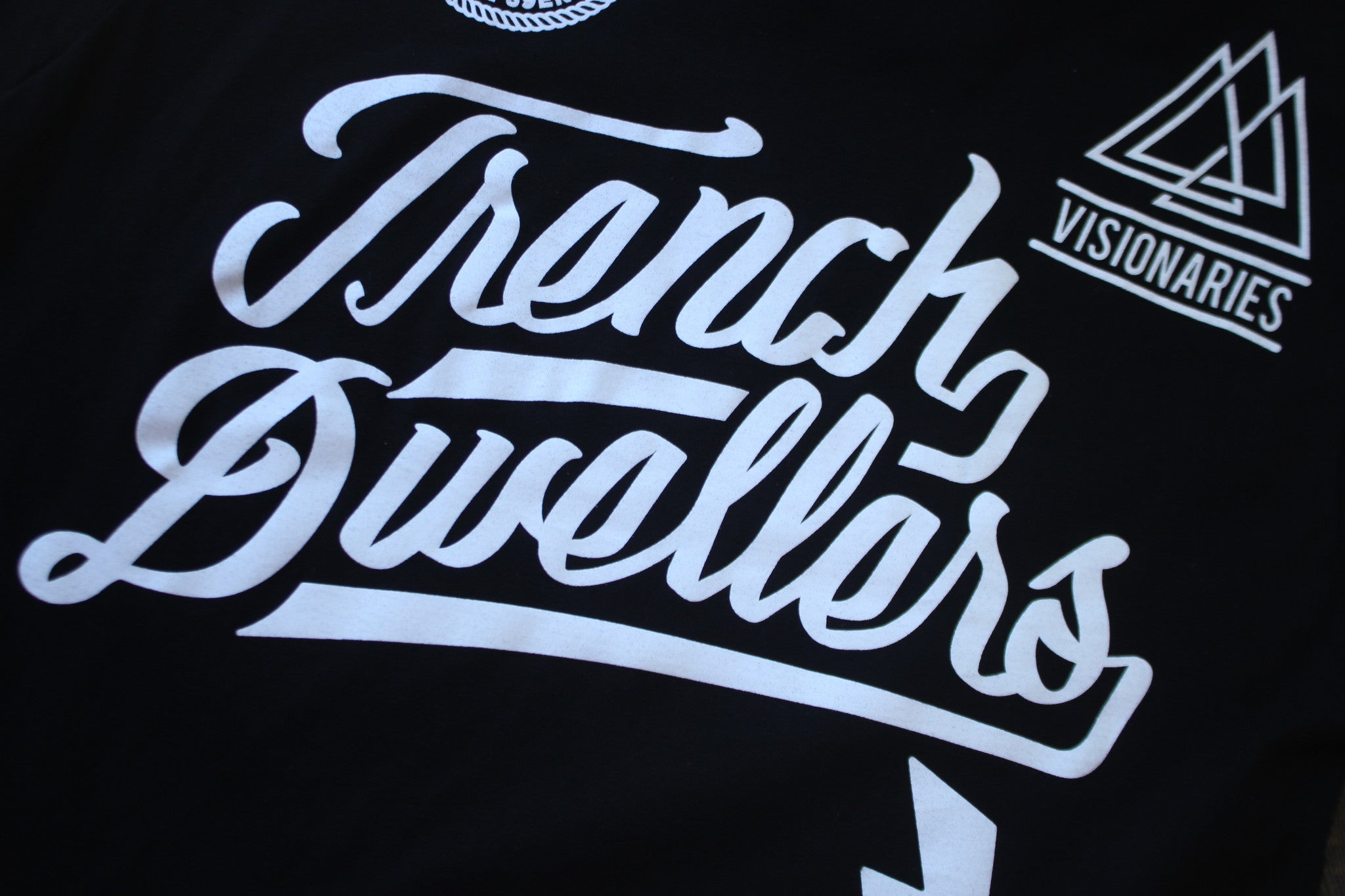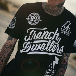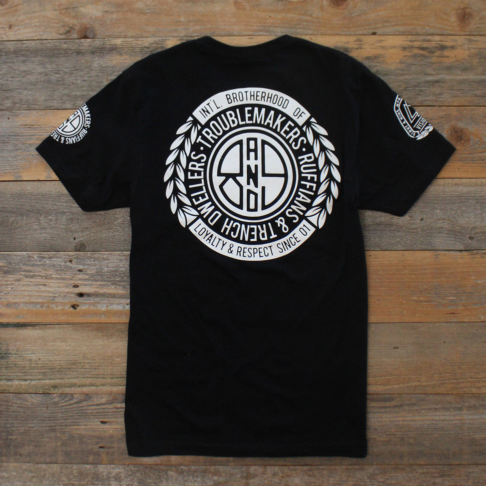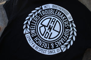 Blue Collar for Summer. Union inspirations. International Brotherhood Of Trouble Makers. Trench Dwellers & Ruffians. Aka Visionaries, peep the details. Premium black cotton with classic white print jumbo front and back prints with multiple hits. #8and9life