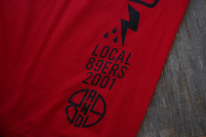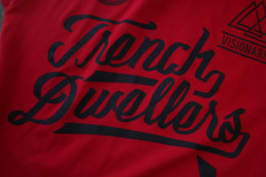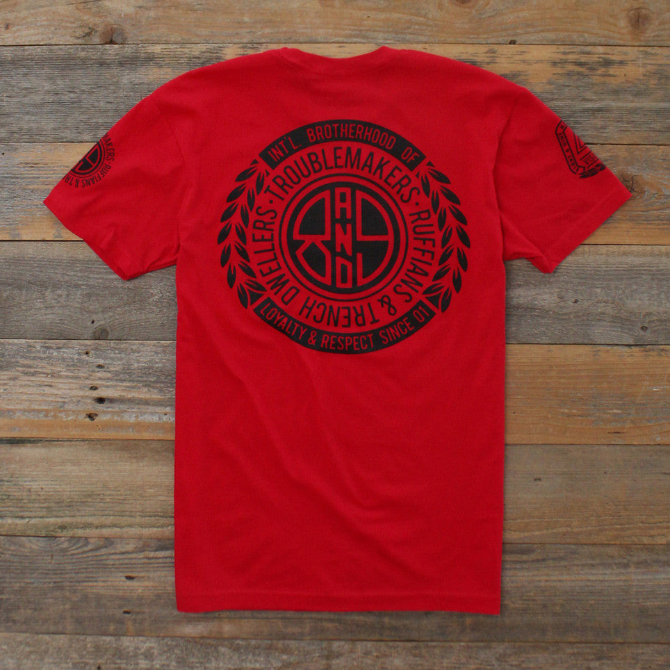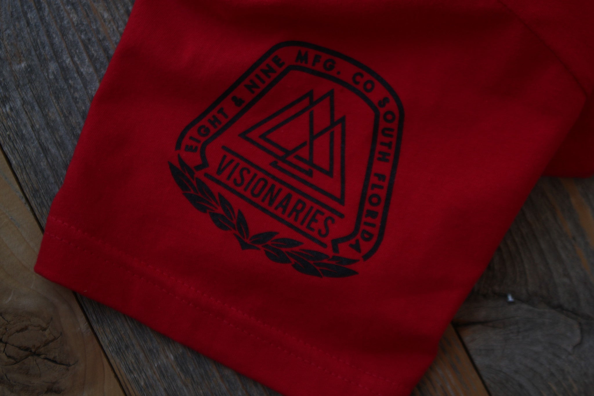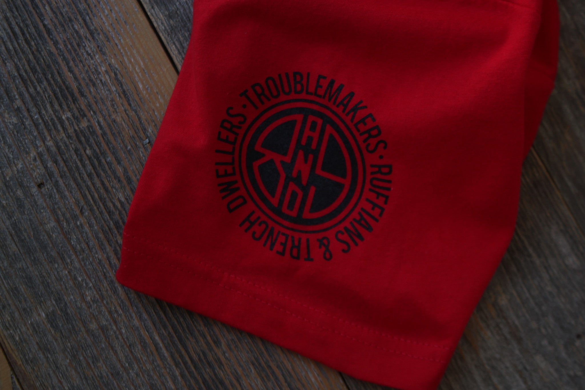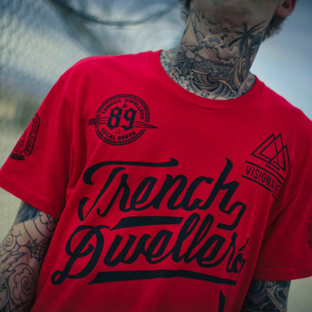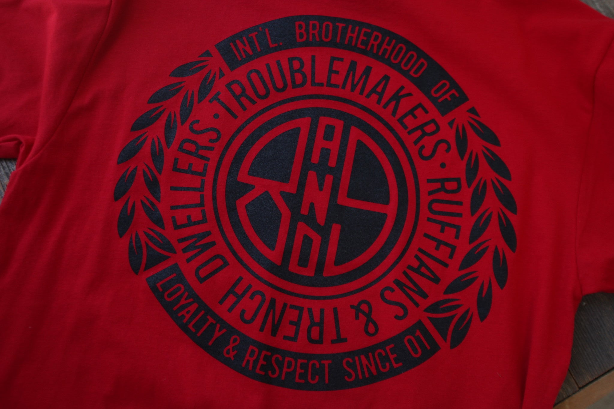 Blue Collar for Summer. Union inspirations. International Brotherhood Of Trouble Makers. Trench Dwellers & Ruffians. Aka Visionaries, peep the details. Premium red cotton with classic black print jumbo front and back prints with multiple hits. #8and9life