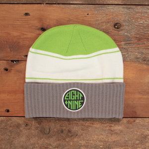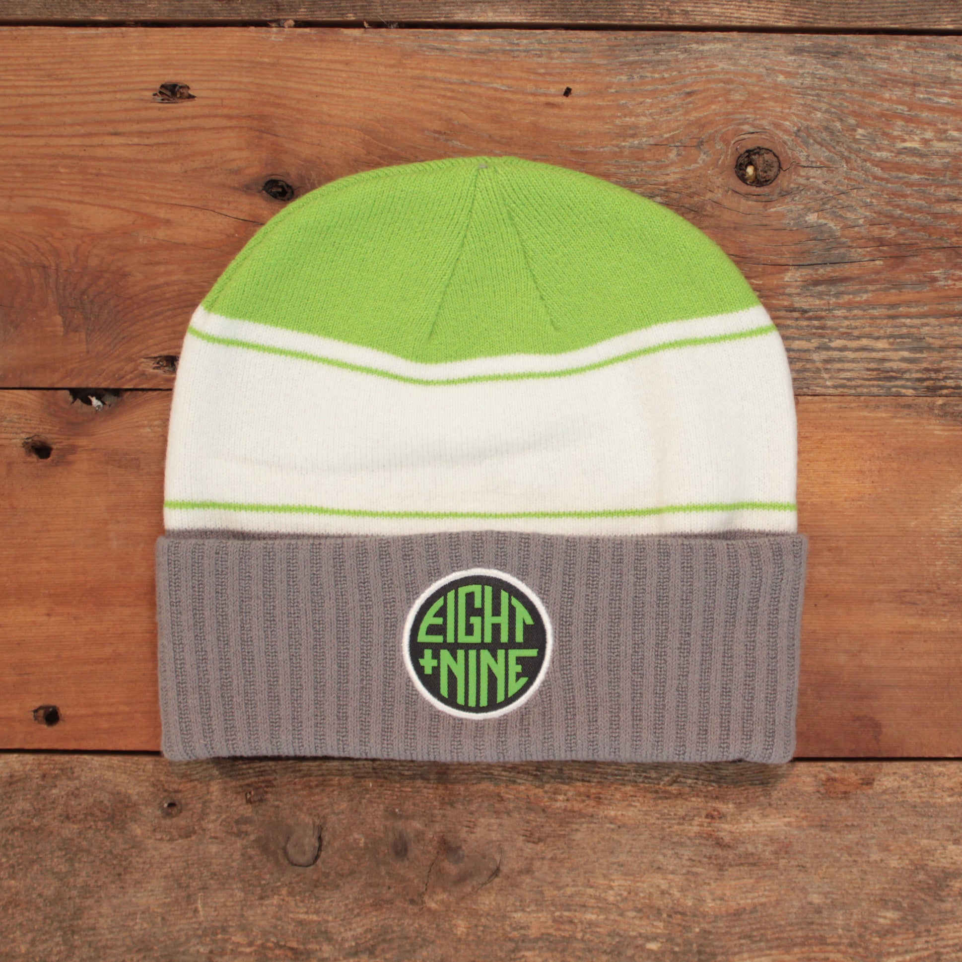 100% Super Soft Acrylic Knit, Ribbed, Jacquard Pattern, Cuffed or Slouch Styling. Neon Green/Grey/White, striped hat with Winner's Circle embroidered patch logo.
